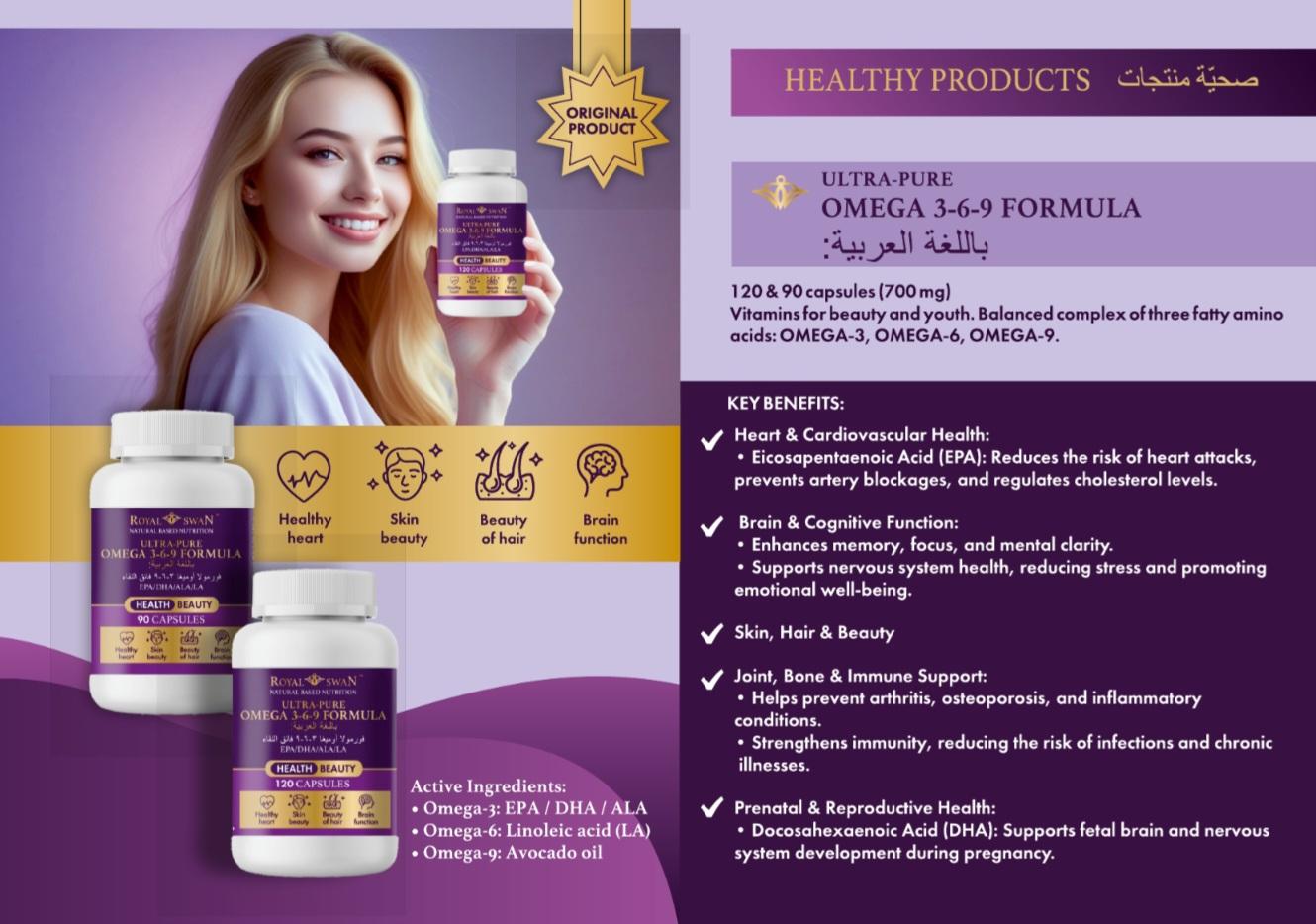 ULTRA-PURE OMEGA 3-6-9 FORMULA o Description: The perfect balance of three essential fatty acids, working together for beauty, youthful energy, and cardiovascular health. High-Purity Fatty Acid Complex – Promotes cardiovascular wellness and supports the vitality of hair and skin.