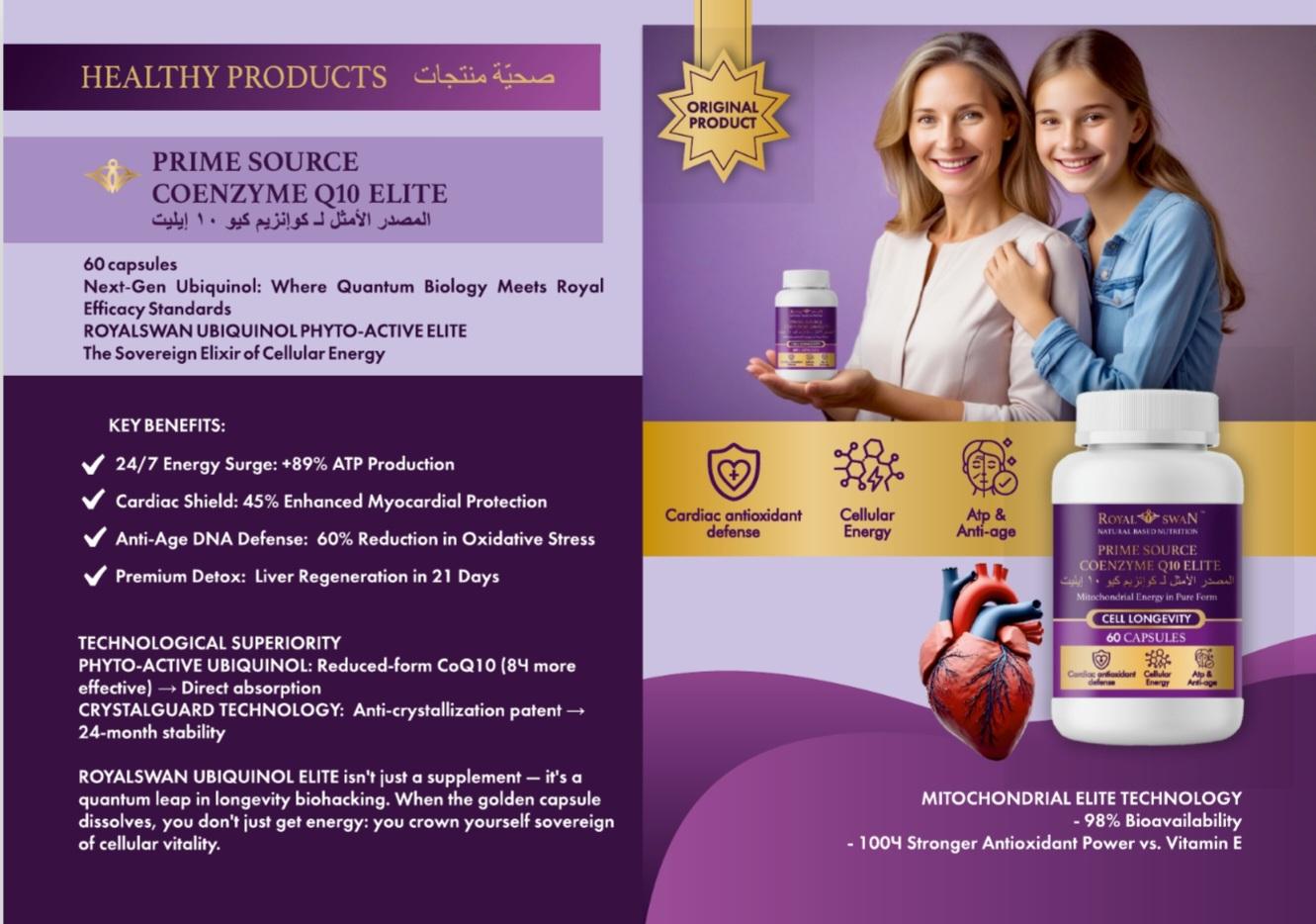 PRIME SOURCE COENZYME Q10 ELITE (Ubiquinol) o Description: The ultimate cellular energy elixir, in its active ubiquinol form. It kickstarts ATP production, protects your heart, and helps slow down aging.